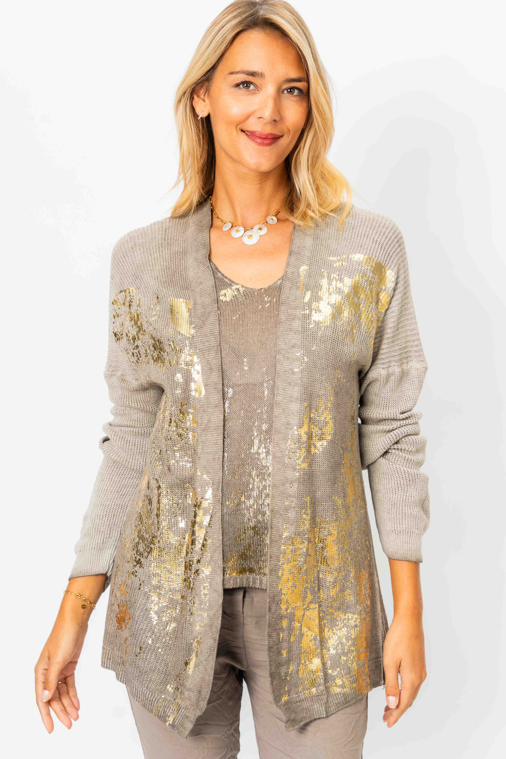 Oversized shimmer knitted cardigan with endless opportunities to style and stay warm + chic! Long sleeves, no pocket, gold shimmer on front only.