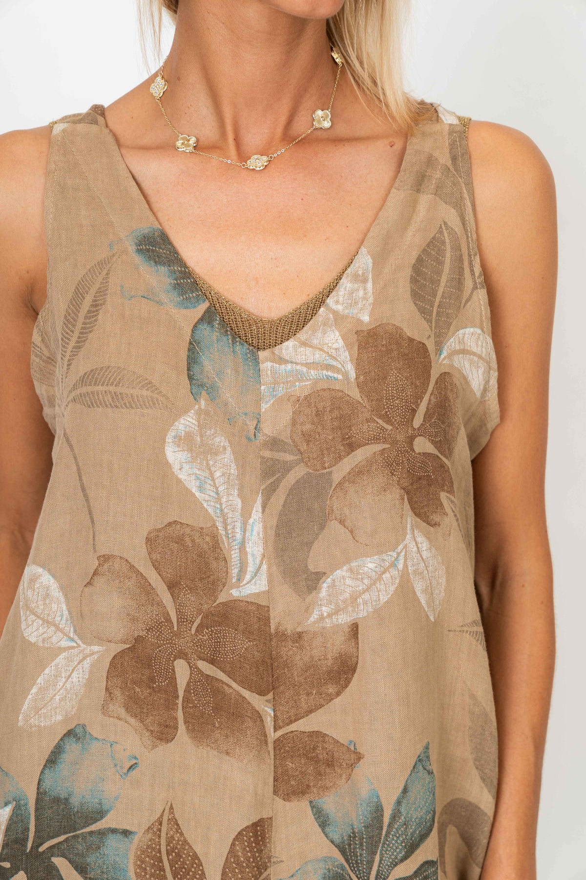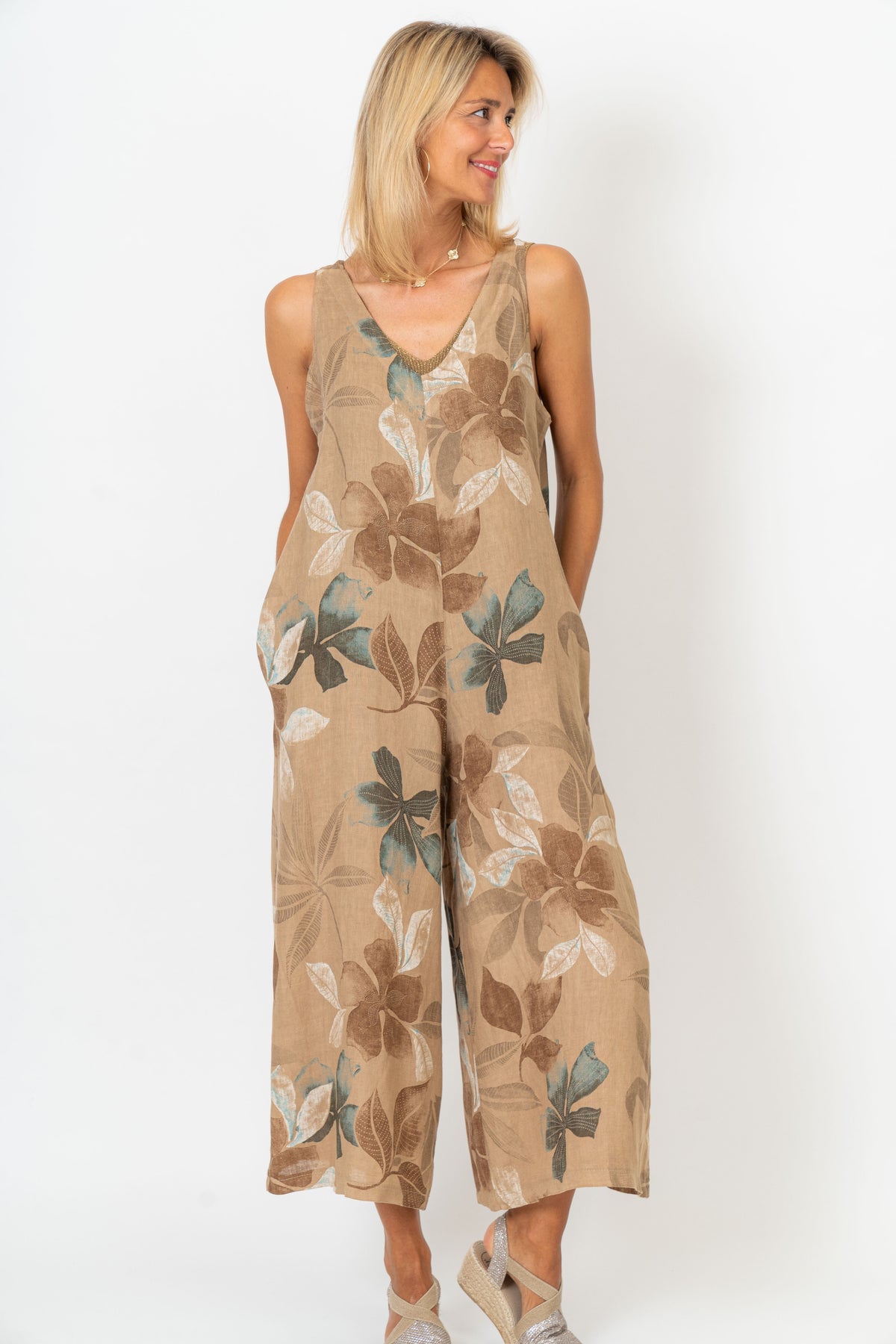 Sleeveless jumpsuit made of a lightweight, tie on back,  natural-colored linen. It features a relaxed, wide-leg cut with a cropped length that falls just above the ankles. The neckline is a soft V-shape, adding a feminine touch. The jumpsuit is adorned with a large, tropical floral print in earthy tones of brown, beige, and hints of teal green, giving it a casual yet elegant, summery vibe.